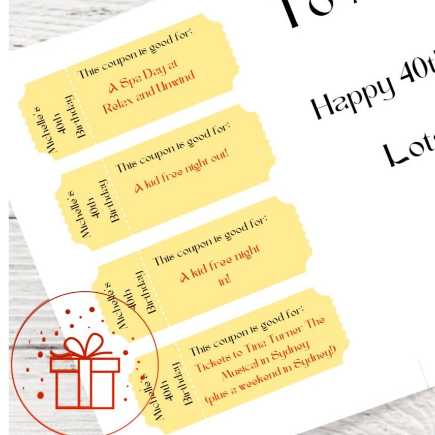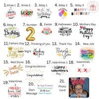 Tell us your occasion and we will make up a greetings card to complete your gift. With numerous designs to choose from please look at the photos and tick which suits your occasion below then simply add the information in the personalisation section for what you want your card to say; the style; portrait/landscape; add fun vouchers or not. You can also add a name or message decal to the front of your box if you wish - let us know below and check spellings as will will use exactly what you tell us to.