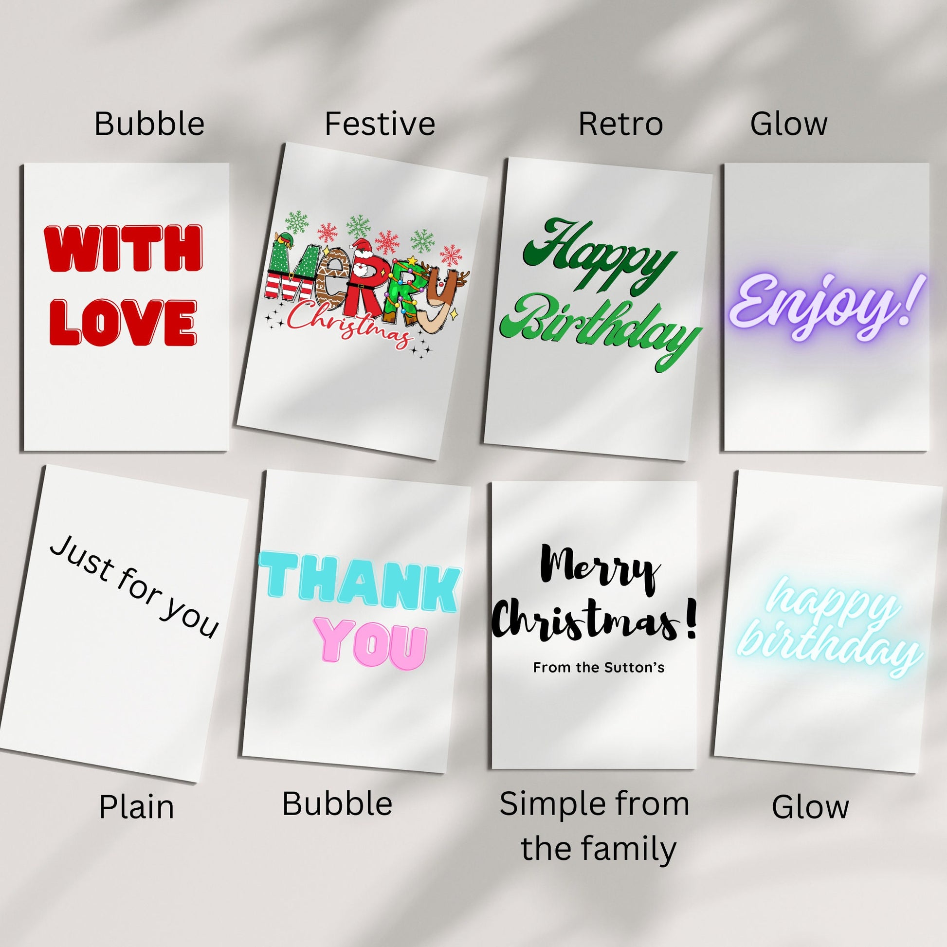 Tell us your occasion and we will make up a card for the inside or outside of your hamper to suit. With numerous designs to choose from, include the recipients name and your message to add the personal touch. Give us the details of what you want your name and theme to be in the personalisation section.